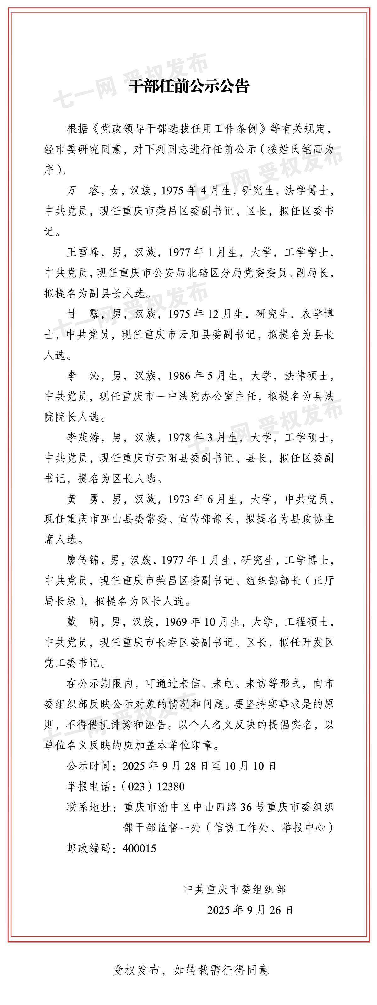 9月26日晚,重庆市委组织部发布干部任前公示公告,经市委研究同意,现任重庆市荣昌区委副书记、区长万容,拟任区委书记。